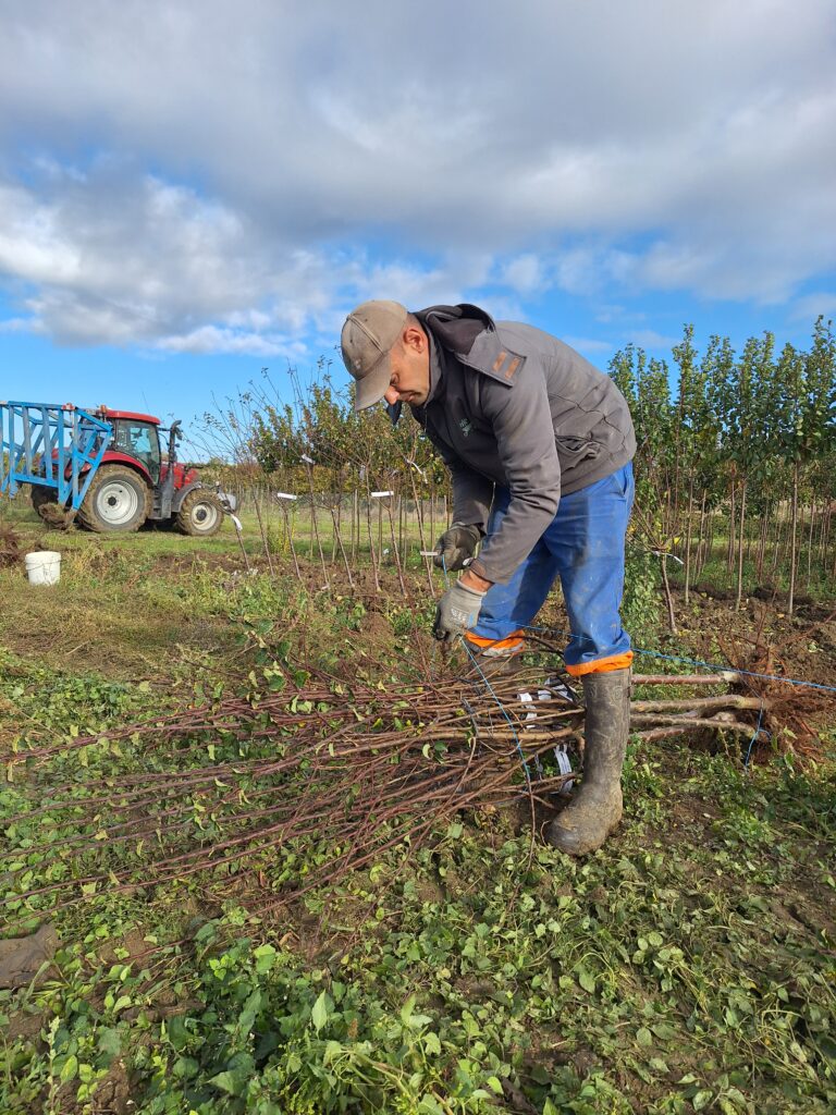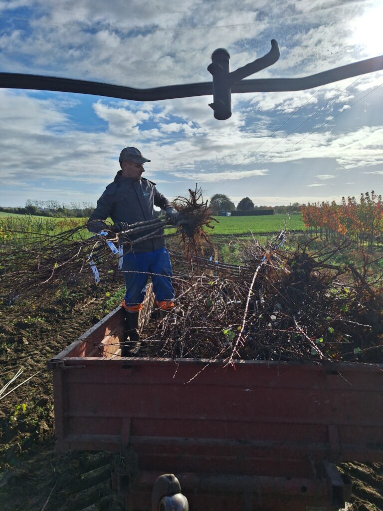 Durant cette saison au rythme intense et aux enjeux forts, nous renforçons l’équipe et faisons appel à deux saisonniers pour assister Samuel. En effet, il ne suffit pas de sortir les arbres de terre. Il faut ensuite les taper pour retirer le maximum de terre tout en préservant les racines, paqueter les plants par lots de cinq ou dix, puis charger la récolte dans la remoque pour l’acheminer vers les jauges de stockage.