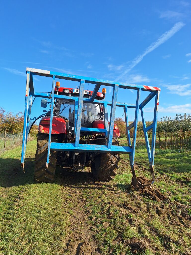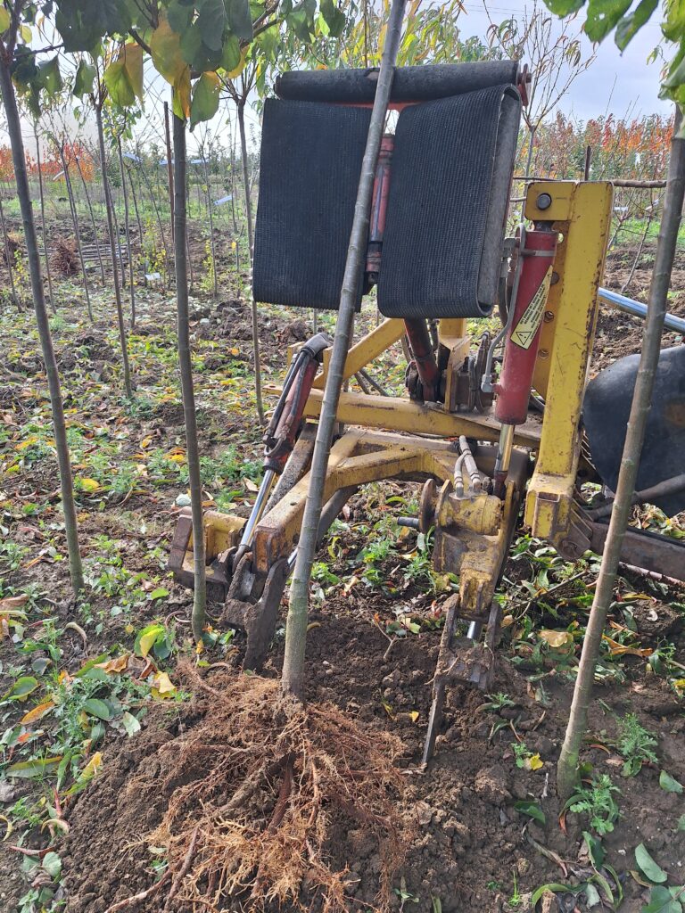 Nous utilisons deux arracheuses différentes selon nos besoins et le type d’arbre. Pour soulever un rang complet de fruitiers destinées à être livrés dans les prochaines semaines, nous employons un tracteur céréalier équipé d’une structure métallique en « U » déporté. Le « U » s’enfonce en terre au début du rang, passe sous les racines sur toute la longueur du rang et en ressort à l’autre bout. Les arbres sont ainsi soulevés, les plus grosses racines coupées et la terre décompactée. Il faut ensuite arracher les plants un à un manuellement et les débarrasser de la terre superflue.