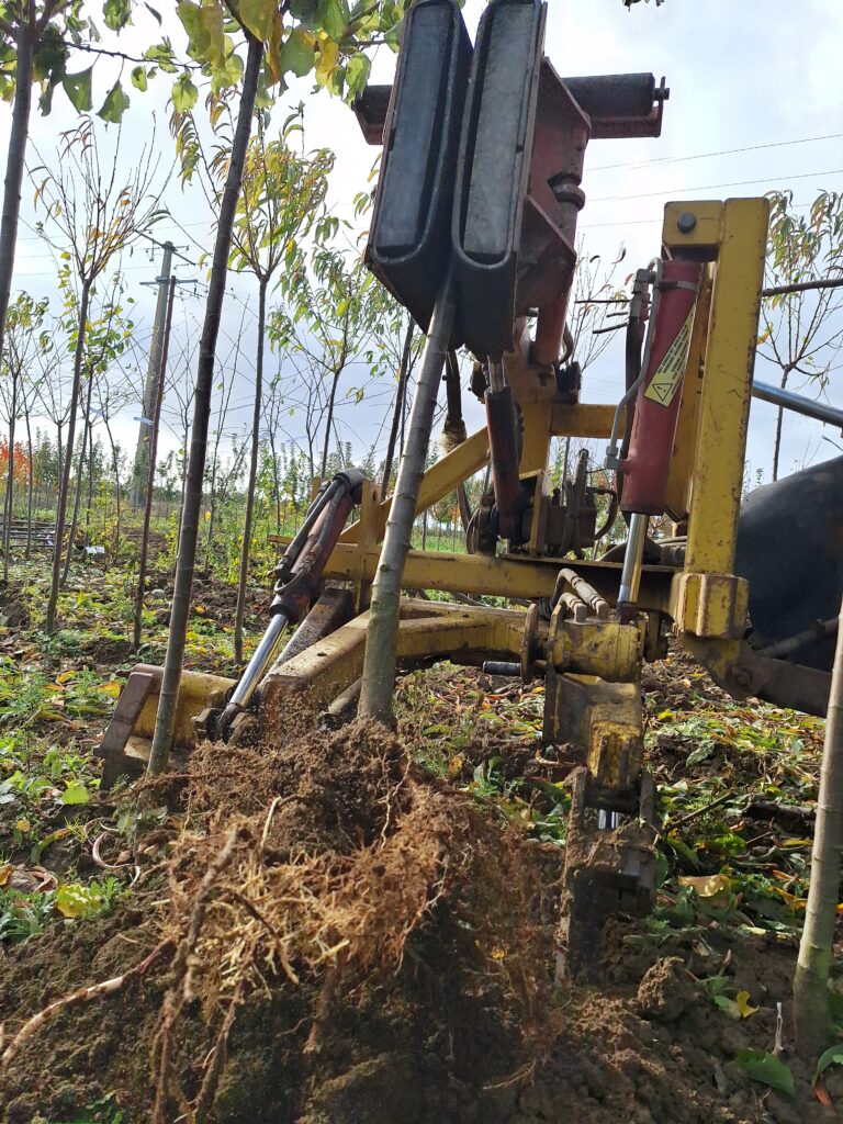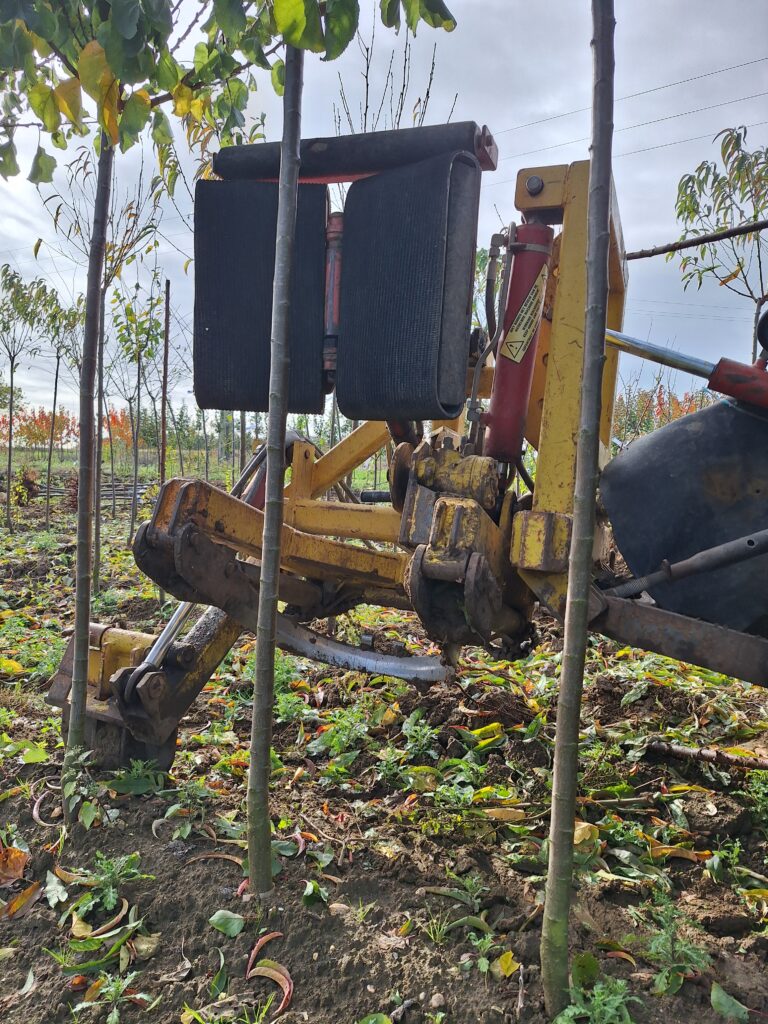 Cette arracheuse n’est pas adaptée aux grand arbres qui ne passent pas en hauteur dans la structure mais elle est idéale et rapide pour les scions ou les quenouilles. De plus, le gabarit du tracteur ne permet pas de passer entre deux rangs de pépinière : nous devons donc arracher les rangs les uns après les autres pour que le tracteur puisse travailler sur le rang suivant.