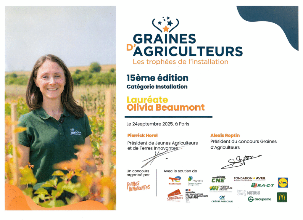 Nous vous en parlions il y a quelques mois, au printemps dernier Olivia s’est inscrite au concours Graine d’Agriculteurs 2025 dans la catégorie Installation. Ce concours d’ampleur national, organisé par Terres Innovantes, le fond de dotation des Jeunes Agriculteurs, est le seul concours agricole où le public peut voter pour le candidat qu’il soutient.
