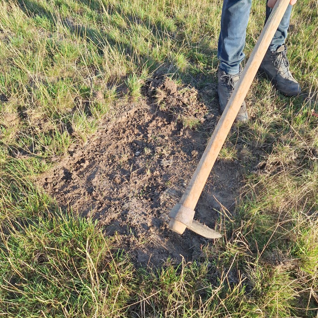 A l’aide d’une barre à mine, fendez la terre, cassez la dernière croute dure sans retirer de matière. Cela permettra aux futures racines de trouver un chemin en profondeur plus facilement et à l’eau de s’écouler plus rapidement.