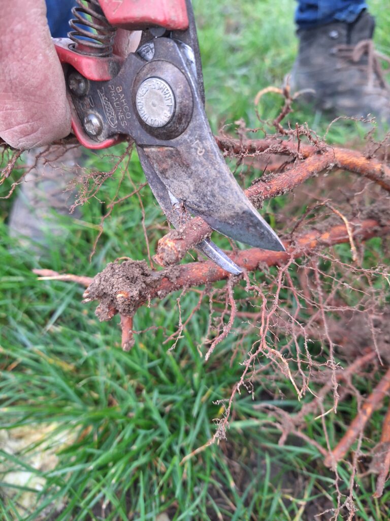 Habillage des racines au sécateur.