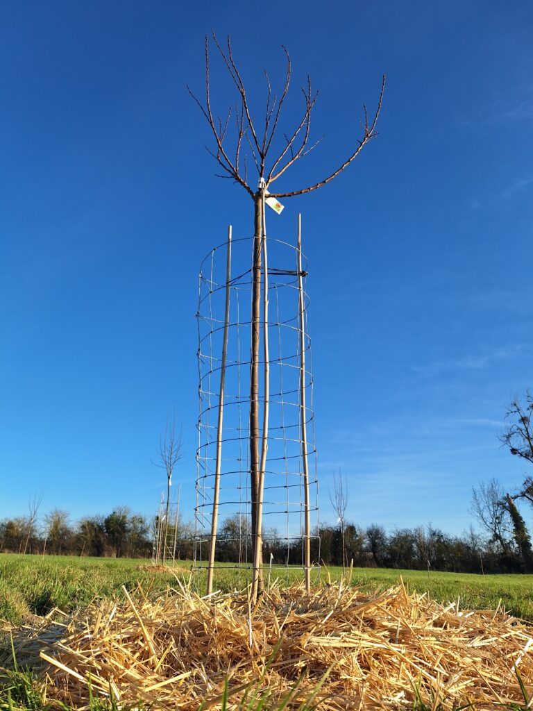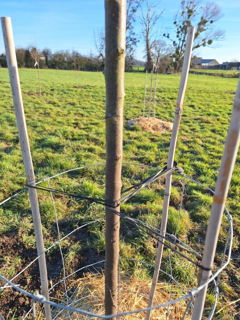 Au vu de la population grandissante de chevreuils dans le secteur et de l’expérience du printemps dernier, il est convenu de protéger les arbres dès leur plantation. Des bandes de grillage à gibier sont découpées et positionnées autour des troncs. Trois tuteurs de bambou sont placés à l’intérieur du grillage pour le maintenir en place et éviter que celui-ci ne blesse l’écorce.