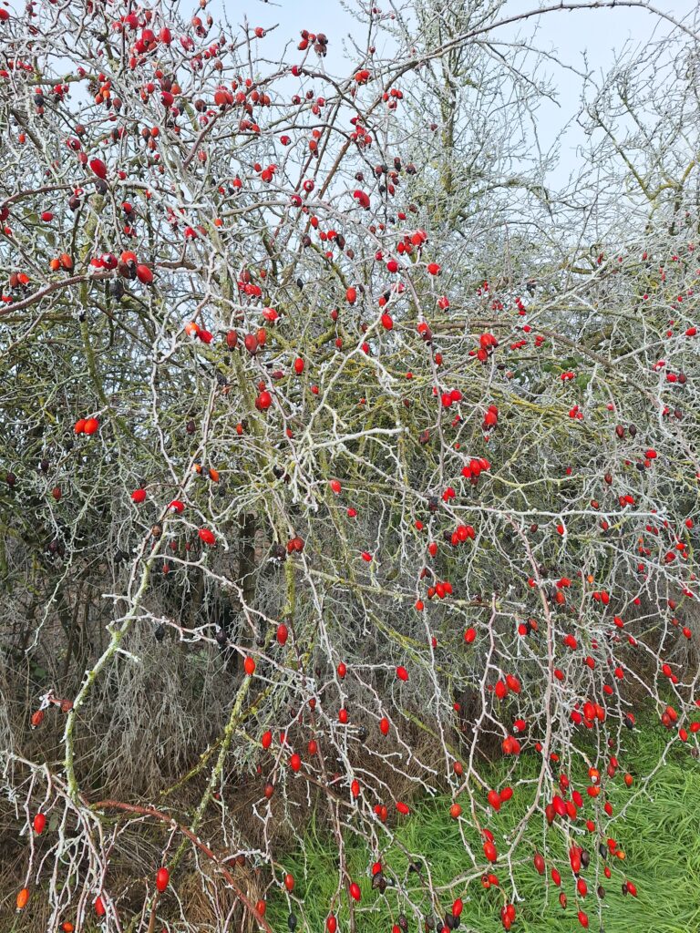 Baies de cynorrhodon dans la haie bordant le verger.
