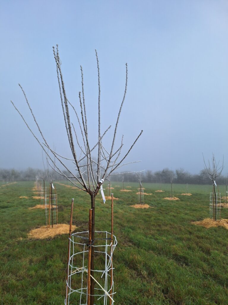 Nous n’avons pas taillé les fruitiers dès la plantation car une vague de froid était annoncée et elle a bien eu lieu. L’équipe procèdera à cette étape fin février / début mars quand le risque de grosses gelées sera écarté.